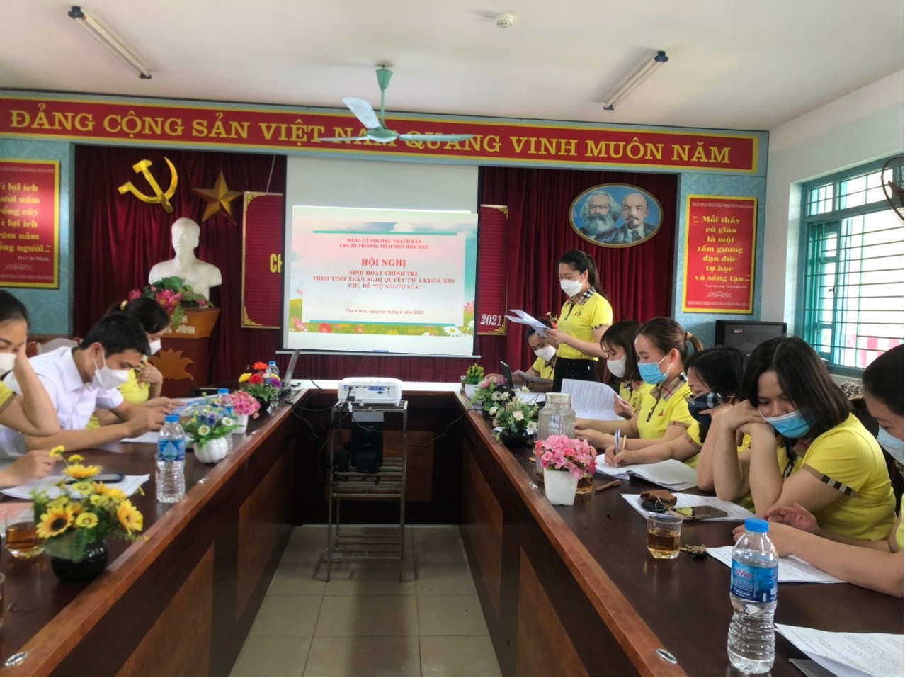 Vào hồi 14h30 chiều ngày 04/03/2022 Chi bộ Trường Mầm Non Hoa Mai long trọng tổ chức buổi sinh hoạt chính trị trong đảng theo tinh thần Nghị quyết Trung ương 4 khóa XIII với chủ đề “tự soi, tự sửa” Hội nghị sinh hoạt được diễn ra nghiêm túc dưới sự chủ trì của đồng chí Trần Thị Nghĩa Quỳnh - Bí thư chi bộ -Hiệu trưởng nhà trường và 100% các đ/c đảng viên tham dự.