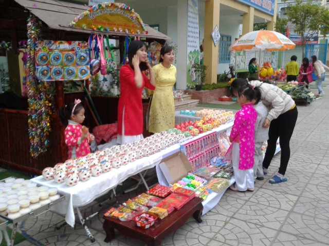 cũng tất bật chuẩn bị cho hội chợ: Từ tổ văn phòng, các cô giáo đến bác nhà bếp