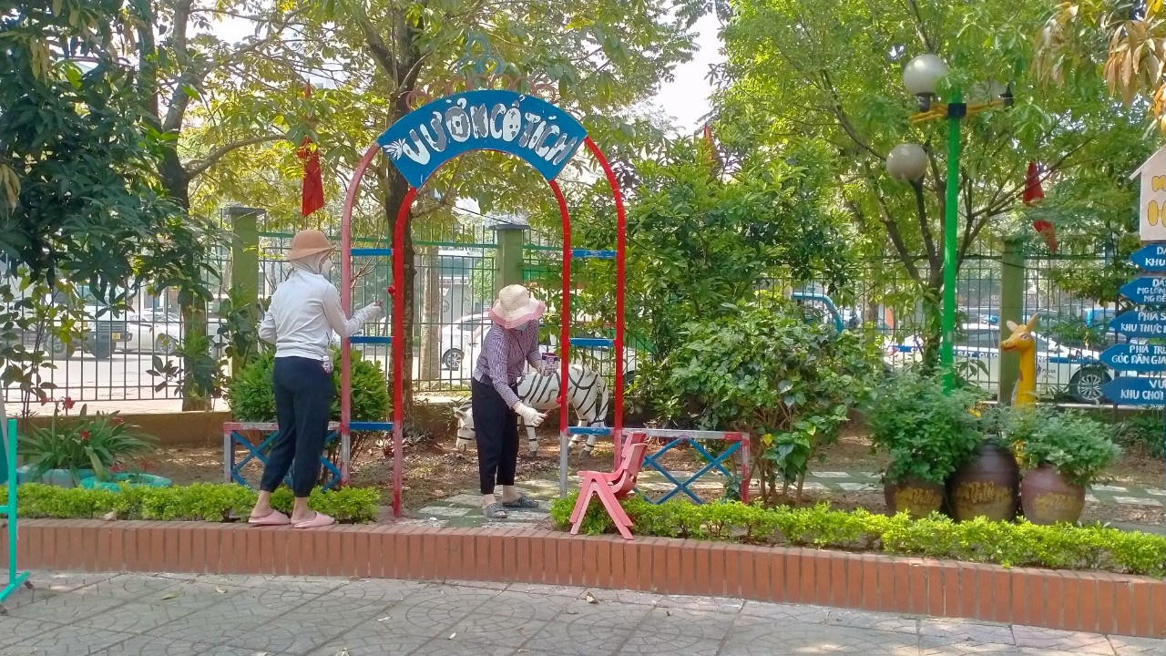 Với tinh thần quyết tâm đẩy lùi dịch bệnh, tạo một môi trường Xanh- An toàn- Thân thiện, tập thể CBGVNV dưới sự chỉ đạo sát sao của Ban Giám Hiệu nhà trường đã tham gia tổng vệ sinh trong và ngoài lớp học, và toàn bộ khuôn viên, các phòng ban, bàn ghế, lau chùi, đánh rửa, phơi khô đồ chơi ngoài trời, giặt cọ giường học sinh đặc biệt đồ dùng học tập và đồ chơi của trẻ tại lớp học. Bên cạnh đó các GV đã không ngại thời tiết nắng nóng tham gia sơn lại tất cả các đồ chơi ngoài trời trong khuôn viên nhà trường để tạo khung cảnh sư phạm đẹp- an toàn cho trẻ mọi lúc mọi nơi.