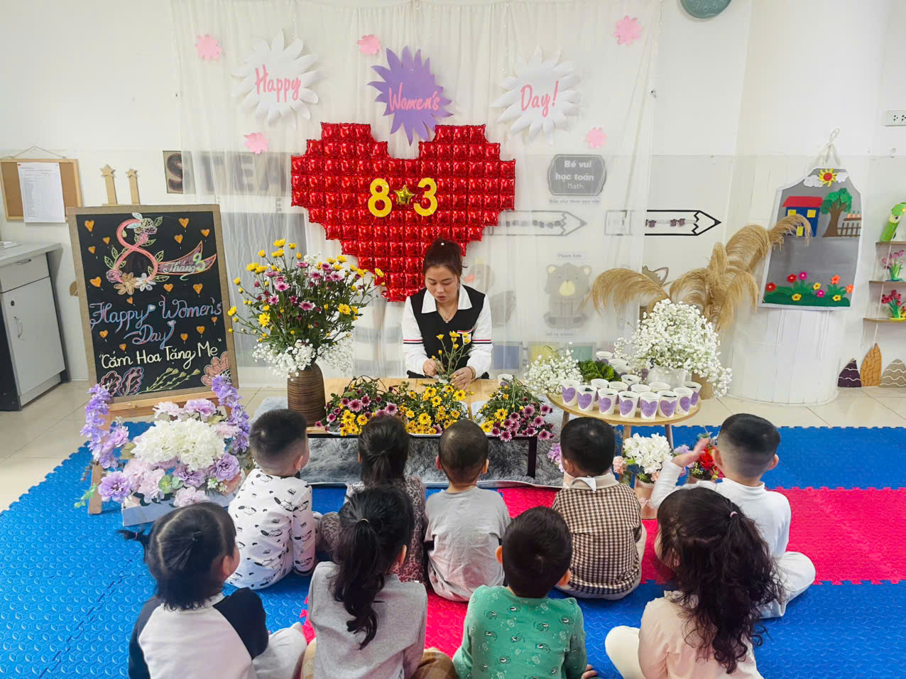 Hòa chung không khí vui tươi chào mừng Ngày quốc tế phụ nữ 8/3, các bé lớp MGB C1 đã tham gia nhiều hoạt động ý nghĩa. Dưới sự hướng dẫn của cô giáo, các con cùng nhau cắm những lãng hoa xinh tươi để tặng bà, tặng mẹ. Tuy còn nhỏ nhưng các bé rất chăm chú, tỉ mỉ trong từng sản phẩm. Không khí lớp học trở nên rộn ràng với tiếng cười và niềm vui. Thông qua hoạt động này, các bé học được cách thể hiện tình cảm yêu thương và sự quan tâm đến những người phụ nữ thân yêu trong gia đình.
