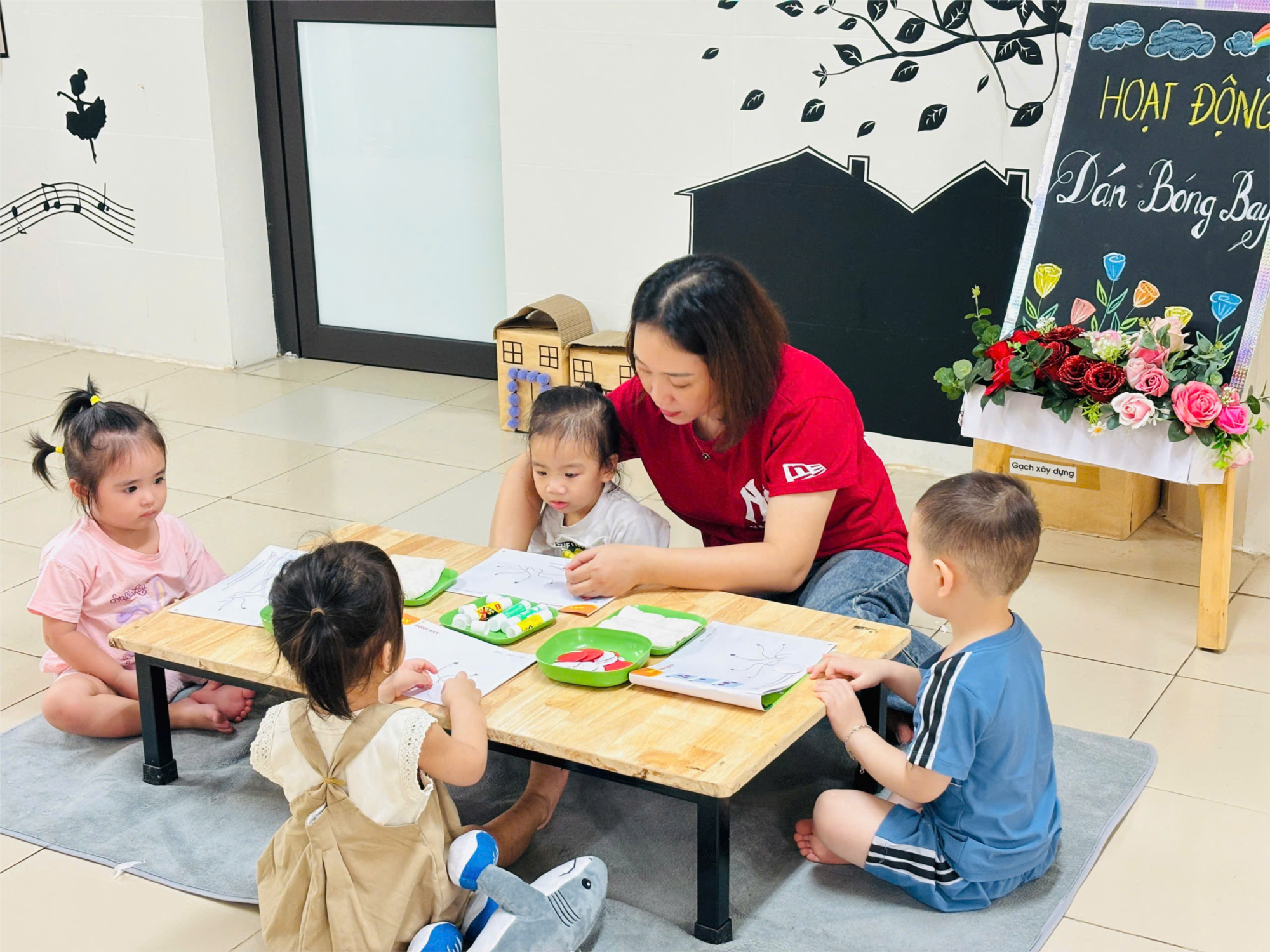 Hôm nay, các bé lớp Nhà trẻ D1 đã cùng cô giáo tham gia hoạt động “Bé dán chùm bóng bay bằng giấy màu”. Với những tờ giấy hình tròn màu đỏ, hồ dán và sự khéo léo của đôi tay, các bé đã tạo nên những chùm bóng bay màu đỏ thật đẹp và sinh động. Bé cẩn thận dán những hình tròn làm bóng, dán chúng thành từng chùm . Hoạt động không chỉ giúp trẻ rèn luyện kỹ năng dán, phát triển sự khéo léo, óc sáng tạo mà còn giúp bé nhận biết phân biệt màu đỏ đồng thời mang lại niềm vui và hứng thú học tập.