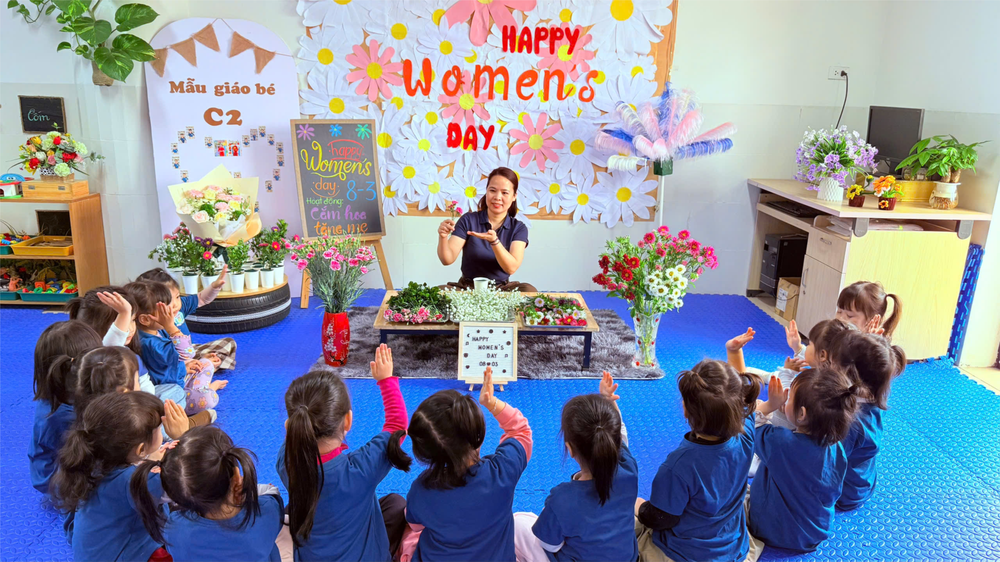 Nhân dịp Ngày Quốc tế Phụ nữ 8/3, các bé lớp MGB C2 đã tham gia hoạt động trải nghiệm cắm hoa tặng mẹ vô cùng ý nghĩa. Dưới sự hướng dẫn của cô giáo, các bé được làm quen với các loại hoa và tự tay lựa chọn, sắp xếp những bông hoa nhiều màu sắc vào lọ. Những đôi bàn tay nhỏ xinh chăm chú cắm từng bông hoa với sự hào hứng và thích thú.