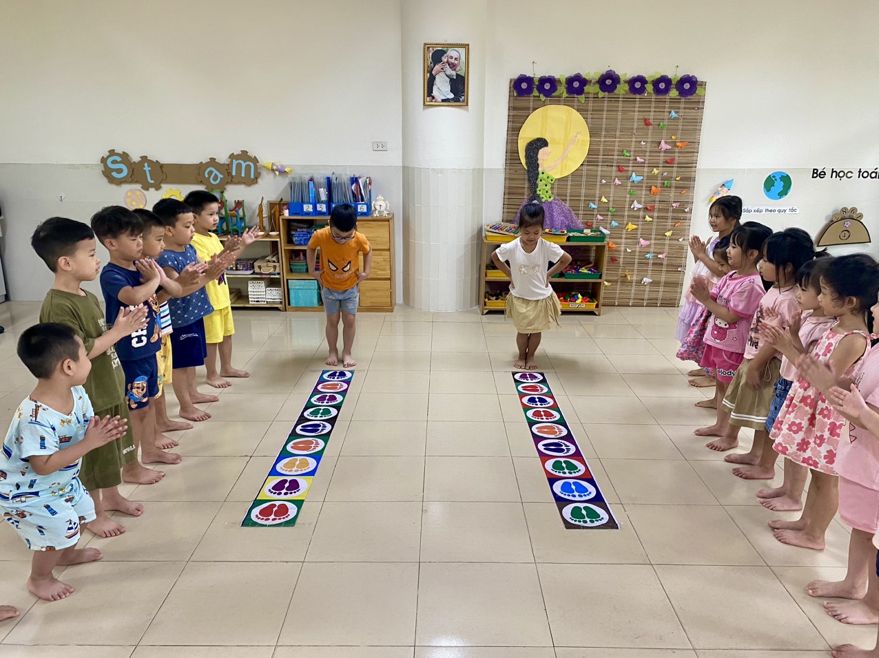 Giáo dục thể chất cho trẻ mầm non có vai trò hết sức quan trọng đối với sự phát triển của trẻ, giúp trẻ phát triển khỏe mạnh, tăng sức đề kháng và phát triển tư duy toàn vẹn. Đồng thời hoạt động này cũng giúp trẻ hoàn thiện các hình thái, chức năng của cơ thể và phát triển phẩm chất tốt đẹp. Hiểu được vai trò và tác dụng to lớn của hoạt động thể chất với trẻ mà cô trò lớp MGN B1 đã có buổi hoạt động "Nhảy theo hướng bước chân". Đây là hoạt động đòi hỏi sự phối kết hợp giữa tay, chân và mắt một cách nhịp nhàng. Dưới đây là một số hình ảnh của buổi hoạt động