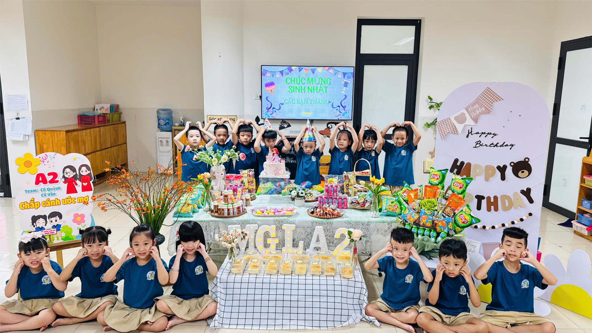 Hôm nay, tại lớp MGL A2, các bé đã cùng nhau tổ chức hoạt động “Bé vui sinh nhật tháng” thật rộn ràng và ấm áp. Những bạn nhỏ có ngày sinh trong tháng được cô và các bạn dành tặng nhiều lời chúc tốt đẹp cùng những món quà nhỏ xinh. Lớp học được trang trí bằng bóng bay, hoa và bánh kem thật đẹp mắt. Các bé cùng nhau hát vang bài hát “Chúc mừng sinh nhật”, thổi nến, cắt bánh và chia sẻ niềm vui ngọt ngào.