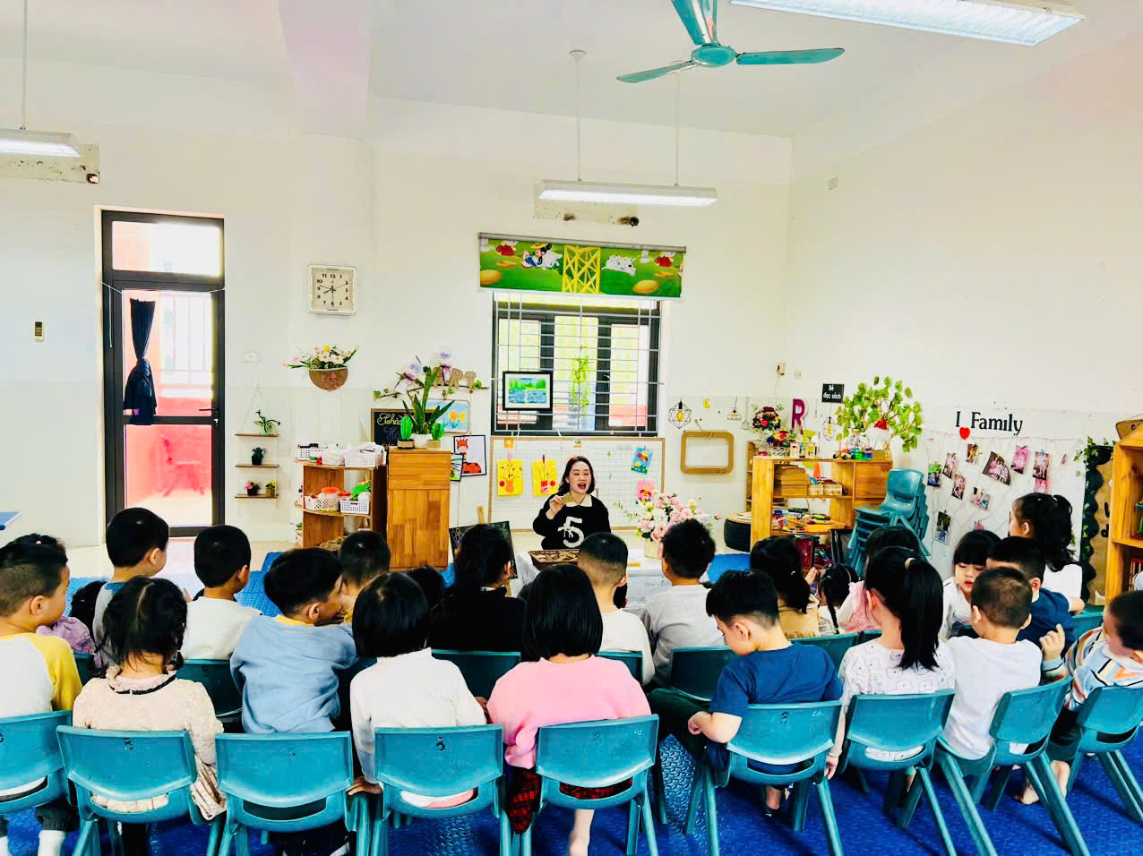 Chào mừng quý phụ huynh đã đến với hoạt đông “Đồ các hình khối để tạo thành bức tranh” của các bé lớp MGN B2. Đến với hoạt động này các bé đã được khám phá nghệ thuật và tư duy hình học thông qua trò chơi. Bằng việc sử dụng các khối hình để in lên giấy, thông qua hoạt động các bé phát triển kỹ năng vận động tinh, nhận biết màu sắc và hình dạng. Hoạt động không chỉ khơi gợi sự sáng tạo mà còn giúp các bé hình thành khả năng tư duy logic và sắp xếp. Thật là thú vị khi sản phẩm cuối cùng là những bức tranh đầy màu sắc phải không ạ!"