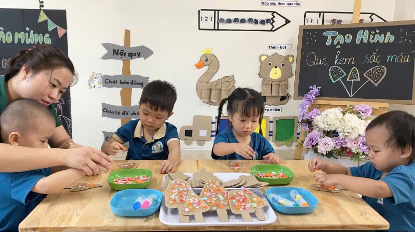 Kết thúc hoạt động, cả lớp đã có một “bộ sưu tập que kem” đủ màu sắc thật đẹp. Bé nào cũng vui mừng, tự hào khi cầm trên tay sản phẩm do chính mình làm ra. Đây là trải nghiệm vừa học vừa chơi bổ ích, giúp trẻ thêm yêu thích hoạt động tạo hình và rèn luyện tính kiên trì.