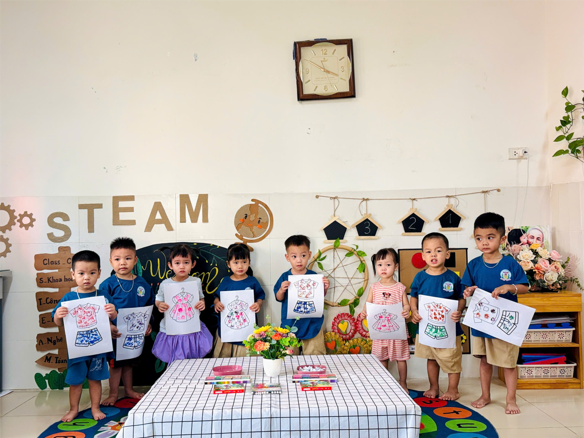 Trong giờ học tạo hình, các bé lớp mẫu giáo đã được tham gia hoạt động vô cùng thú vị: “Trang trí quần áo – váy”. Với nhiều hình thức sáng tạo như in vân tay, dán giấy màu, tô màu và in hoa, các bé đã khéo léo biến những mẫu trang phục đơn giản thành những bộ quần áo, váy vóc thật rực rỡ và độc đáo.