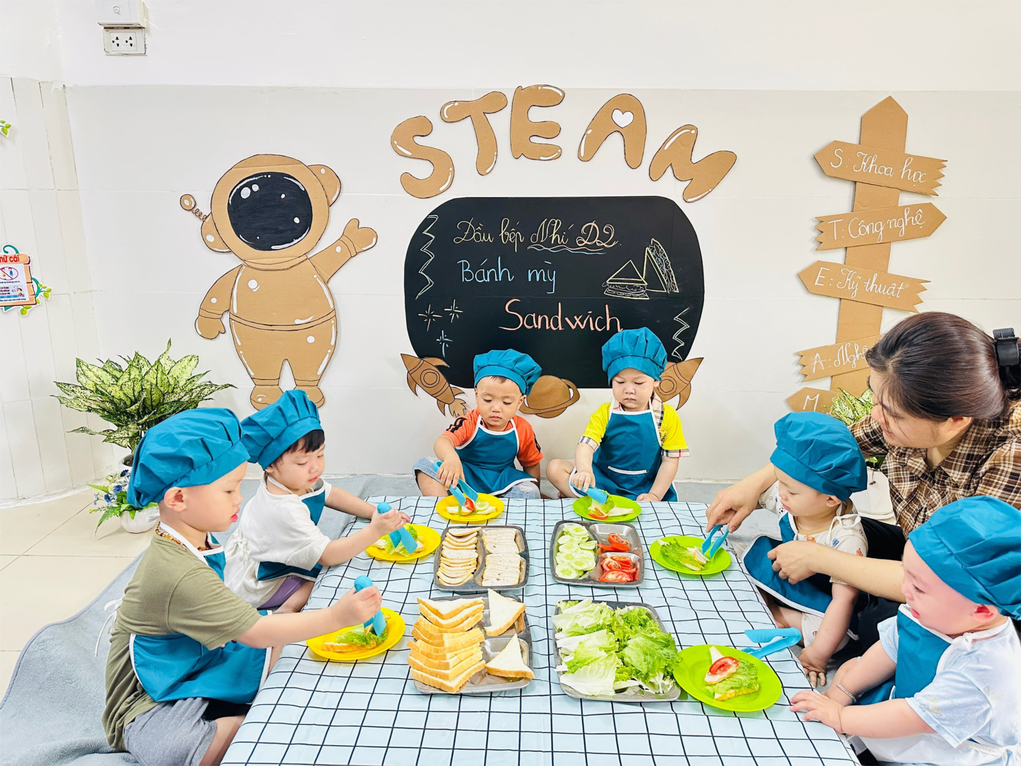 Mời các bạn đến với những đầu bếp nhí của lớp nhà trẻ D2. Ở đây các bạn sẽ được các đầu bếp phục vụ món ăn "Bánh mỳ Sandwich". Với kỹ năng sử dụng kẹp điêu luyện các đầu bếp nhí D2 tạo ra món ăn Sandwich vô cùng hấp dẫn và bắt mắt đấy.Dưới đây là một số hình ảnh của buổi hoạt động