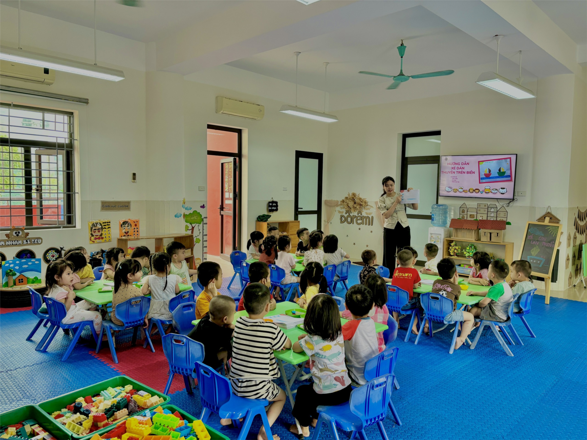 Cứ mỗi giờ hoạt động tạo hình đều đem đến cho các bạn lớp MGB C1 sự hăng say, lý thú lạ thường. Vì ở hoạt động này các bạn được thoả sức sáng tạo thể hiện sự khéo léo của đôi bàn tay. Với chủ đề giao thông các bạn đã dán con thuyền trên biển thật là đẹp đấy.