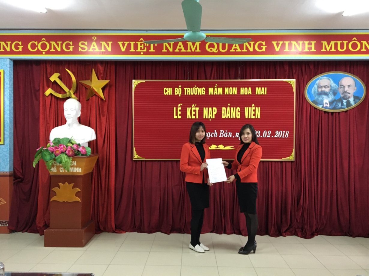 Trong không khí tưng bừng kỉ niệm ngày thành lập đảng cộng sản Việt Nam, chi bộ trường mầm non Hoa Mai tổ chức Lễ kết nạp đảng viên mới. Lễ kết nạp diễn ra theo đúng trình tự, thủ tục điều lệ Đảng dưới sự chủ trì của đồng chí Trần Thị Nghĩa Quỳnh - Bí thư Chi bộ cùng sự tham gia của các đồng chí đảng viên trong Chi bộ nhà trường. Để vinh dự được đứng trong hàng ngũ của Đảng, đồng chí Phạm Phương Linh đã không ngừng phấn đấu và tu dưỡng rèn luyện theo lý tưởng của giai cấp công nhân Việt Nam, của Chủ tịch Hồ Chí Minh và tôn chỉ mục đích của Đảng Cộng sản Việt Nam, được chi bộ và quần chúng tín nhiệm cao.