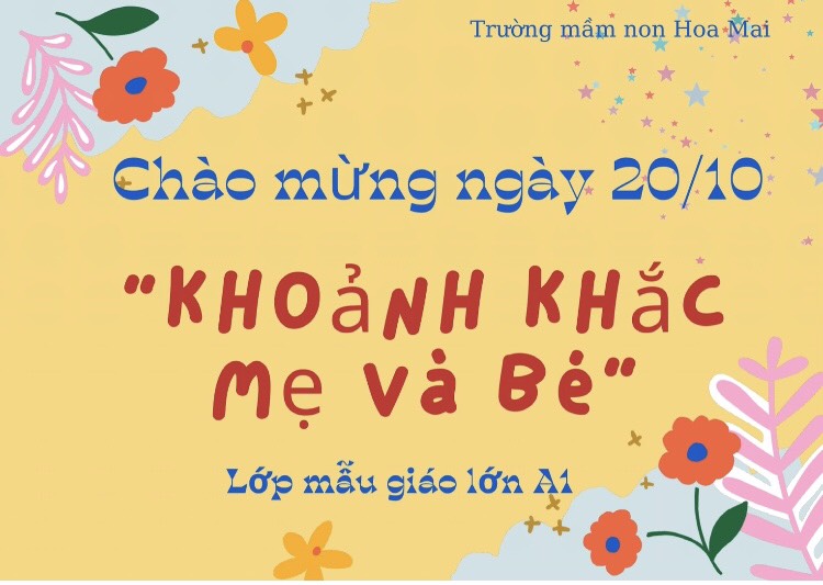 món quà đầy ý nghĩa cùng với các hoạt động chào mừng nhân dịp này. Và để hòa trong không khí tưng bừng đó trường mầm non Hoa Mai đã tổ chức cuộc thi khảng khác “Mẹ và bé” để tôn vinh những người phụ nữ Việt Nam. Với thông điệp “ Hạnh phúc của con là nhìn thấy nụ cười của mẹ” Lớp mẫu giáo lớn A1 cùng tất cả các con học sinh và các bậc phụ huynh đã cùng gửi những bức ảnh thật là ý nghĩa và đẹp để các cô làm thành video và tham dự cuộc thi với tất cả các lớp trong trường. Qua đó giúp các con hiểu được sự yêu thương của các bà, các mẹ dành cho các con. Sau đây là 1 số hình ảnh tham gia cuộc thi của lớp mẫu giáo lớn A1.