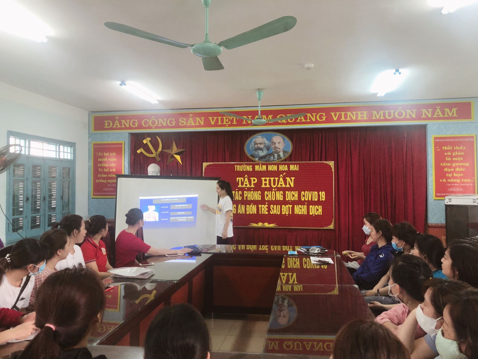 Tham dự buổi tập huấn có Ban Giám hiệu và toàn thể các đc GV-NV của nhà trường, đặc biệt là Ban chỉ phòng chống dịch Covid-19 của trường mầm non Hoa Mai