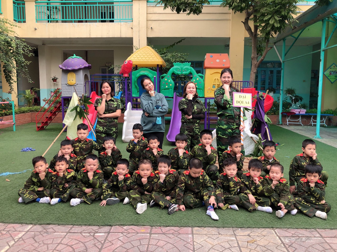 Nhân ngày thành lập quân đội nhân dân Việt Nam với mục đích rèn luyện sức khỏe, kỹ năng sống, kỹ năng tự chăm sóc bản thân cho trẻ, cô và trò lớp lớn trường mầm non Hoa Mai đã tổ chức hoạt động trải nghiệm “ Bé là chiến sĩ tí hon ” nhằm giúp trẻ hiểu được ngày truyền thống của các anh bộ đội cụ Hồ.