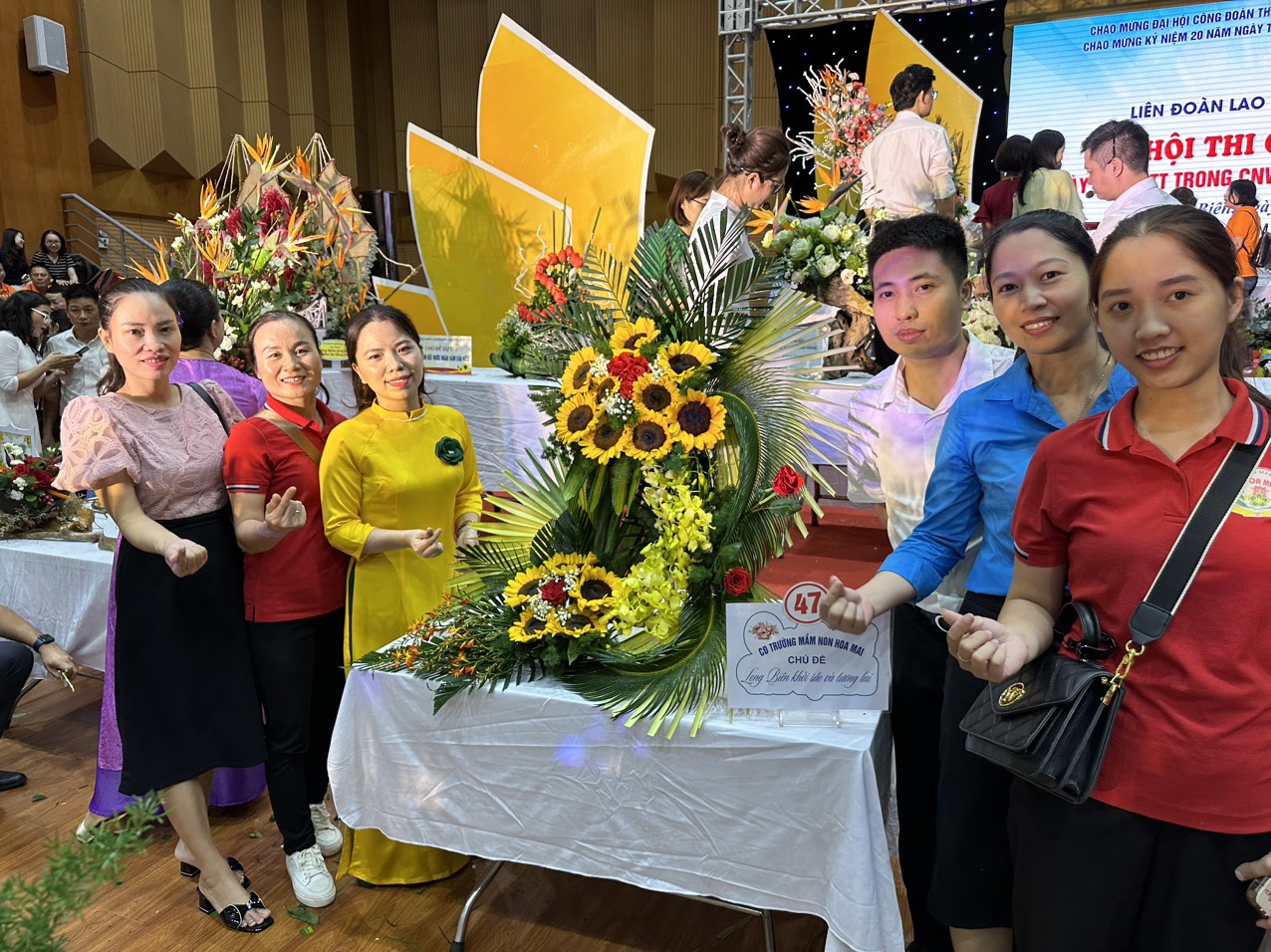 Với mục tiêu phát huy và nâng cao tinh thần thể dục, thể thao trong nhà trường. Trường Mầm non Hoa Mai đã tích cực tham gia các môn thi đấu mà liên đoàn phát động như cầu lông, bóng bàn, kéo co…Với phần thi cắm hoa nghệ thuật trường Mầm non Hoa Mai đã cử 2 đồng chí tham gia đó là đ/c Lưu Thị Mai Vân và Nguyễn Văn Quyết. Đến với hội thi 2 đồng chí đã hoàn thành tác phẩm “Long Biên khởi sắc và tương lai” với ý nghĩa tổng thể của lẵng hoa, có thể thấy rõ nổi bật là hình ảnh chữ "S" được kết lại từ sắc vàng của hướng dương và sắc đỏ của hoa hồng tượng trưng cho màu lá cờ đỏ sao vàng và tượng trưng cho 2 quần đảo Trường Sa và Hoàng Sa của Việt Nam ta. Với 14 bông hoa hướng dương tượng trưng cho 14 phường của Quận Long Biên. Hoa hướng dương biểu trưng cho niềm tin, hy vọng, luôn hướng về phía mặt trời. Với sự cố gắng sáng tạo của 2 đồng chí đã giành được giải khuyến khích trong phần thi cắm hoa.