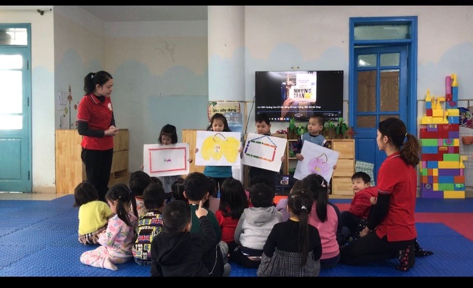 Các cô cho trẻ thực hiện dự án “làm biển tên các phòng trong nhà” Mở đầu các cô cho trẻ tìm hiểu về nôi dung tiết học thông qua cách đặt vấn đề sau khi hát bài hát “The Finger Family”. Sau đó cho tẻ làm thí nghiệm về sự cân bằng để trẻ hiểu và biết cách treo và đo dây sao cho đúng. Sau đó các cô cho trẻ xem các loại biển khác nhau qua video. Cô mời trẻ về nhóm thảo luận và lên ý tưởng của nhóm mình. Mỗi nhóm sẽ tự thiết kế một biển tên phòng theo các cách khách nhau, trẻ được lên giới thiệu về bản thiết kế biển tên của nhóm mình. Sau đó trẻ về và tùy chọn nguyên vật kiệu để làm biển tên phòng. Trẻ có không gian để tự thể hiện khả năng tư duy sáng tạo, có kỹ năng làm việc theo nhóm, thuyết trình.