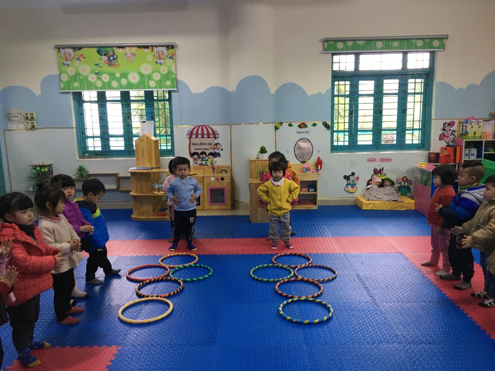 Hoạt động giáo dục thể chất là hoạt động nhằm nâng cao thể lực sức khoẻ của trẻ: Giúp trẻ phát triển các kĩ năng vận động đồng thời giúp trẻ có một sức khoẻ tốt, cơ thể phát triển cân đối, hài hoà, không những thế còn giúp phát triển ngôn ngữ và phát triển nhận thức. Hàng ngày trẻ tới trường cô chăm sóc và giáo dục, việc trẻ được tập luyện phát triển thể chất là vấn đề không thể thiếu trong hoạt động học tập của trẻ. Lớp MGB C3 thường xuyên tổ chức cho trẻ tham gia hoạt động thể chất trong đó có bài tập vận động: Bật chụm tách chân; Trò chơi: Trời nắng - Trời mưa