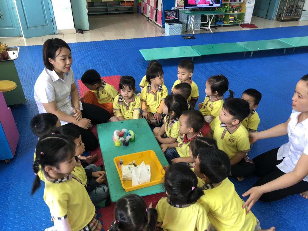 Với tiết học khám phá khoa học Lớp MGB C1 đã có buổi thí nghiệm khoa học sinh động về “Sự kỳ diệu của màu sắc” Từ những nguyên liệu đơn giản, quen thuộc như sữa, nước rửa bát và màu nước, cô giáo đã chỉ dẫn cho cả lớp một số thí nghiệm nhỏ về sự biến đổi của màu sắc. Các bạn được tìm hiểu những điều thú vị, được tận mắt nhìn thấy những chuyển động và biến hóa kỳ diệu của màu nước khi được pha trộn với nhau, màu nước khi kết hơp với sữa và nước rửa bát sẽ cho ra những chiếc cầu vồng rất đẹp. Qua thí nghiệm khoa học kết hợp bài giảng powerpoint, cô giáo đã giải thích rõ ràng, thuyết phục về đặc điểm, vai trò và ứng dụng của màu sắc trong cuộc sống hằng ngày.