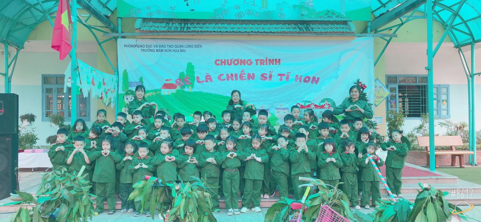 Nhằm hưởng ứng phong trào rèn luyện thân thể theo gương Bác Hồ vĩ đại. Đồng thời giúp trẻ tăng cường tính độc lập, tự chủ, mạnh dạn, tự tin, nâng cao thể chất, phát triển các tố chất nhanh, mạnh, bền, khéo. Vừa qua trường mầm non Hoa Mai đã tổ chức chương trình” Chiến sĩ tí hon” cho các bé khối MGL với mong muốn giáo dục tình cảm yêu quý, biết ơn của thế hệ trẻ đối với công lao, sự hy sinh thầm lặng của các chú bộ đội trong công cuộc xây dựng và bảo vệ Tổ quốc. Phát huy truyền thống tốt đẹp đó, những chiến sĩ tí hon của Trường Mầm non Hoa Mai đã hoàn thành tốt nhiệm vụ của mình, cống hiến những hình ảnh đẹp mắt về thế hệ trẻ, những mầm non tương lai của đất nước.