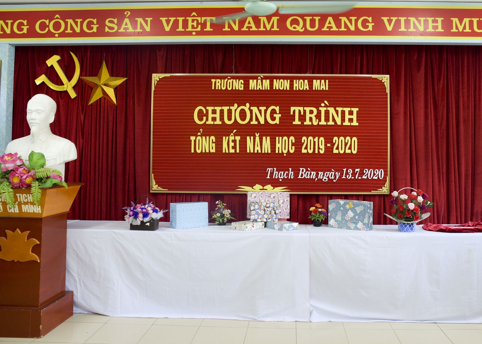 Thứ 2 ngày 13/7/2020 trường mầm non Hoa Mai tổ chức buổi lễ tổng kết năm học 2019 - 2020 và làm lễ ra trường cho các bạn học sinh khối mẫu giáo lớn tại phòng hội đồng trường mầm non Hoa Mai.