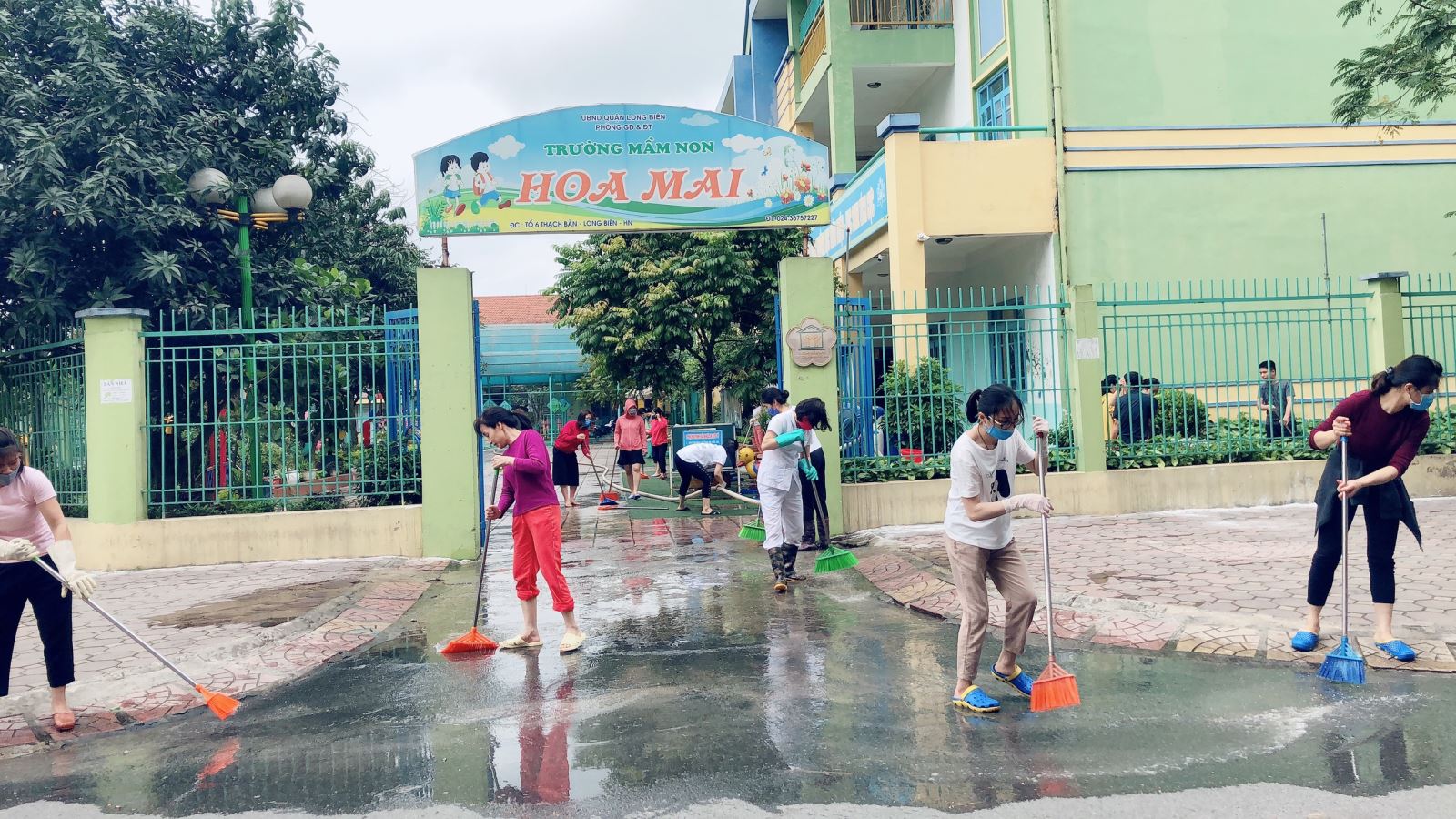 Trước tình hình diễn biến phức tạp của dịch bệnh Covid-19, Sau thời gian thực hiện cách ky xã hội theo chỉ thị 16 của thủ tướng chính phủ, trường mầm non Hoa Mai tiến hành tổng vệ sinh toàn trường để chuẩn bị tốt mọi điều kiện đón trẻ quay trở lại trường học. Đúng 7g giờ 45 phút, toàn bộ CBGVNV nhà trường đã có mặt đầy đủ và đúng giờ. Đồng chí nhân viên y tế và ban giám hiệu nhà trường đã chỉ đạo, phân công nhiệm vụ và cấp phát đồ dùng dụng cụ vệ sinh cho các bộ phận bắt đầu công việc. Các bộ phận được phân công theo tổ, khối đã tiến hành lau dọn, tiêu độc, khử khuẩn tất cả những khu vực được phân công như: khu vực hành lang, nhà bếp, nhà để xe, khu vườn trường, sân trường, ngoài cổng trường, tay vịn cầu thang, đồ chơi ngoài trời... Tất cả các công việc đều được tiến hành khẩn trương, đảm bảo các khu vực đều được vệ sinh gọn gàng, sạch sẽ.
