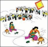 Mỗi nhóm 10 người (cả nam và nữ), họ tự xay thóc, giã gạo, dần sàng, lấy lửa, lấy nước và nấu cơm.